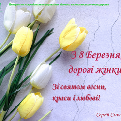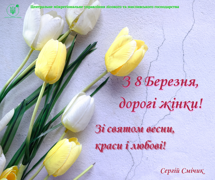 Шлю Вам теплі і щирі слова привітання зі святом! Ви завжди поряд з нами – і в труднощах, і в радості. В цей день щиро дякую вам, шановні колеги, за вашу невтомну працю, за те, що ділите з нами нелегкі трудові будні, надихаєте нас на гарні справи, що розумієте нас і підтримуєте. Нехай у ваших оселях завжди живуть злагода, добробут та спокій, а кожен день буде сповнений добра, надії і любові. А найголовніше – бажаю усім нам такої жаданої Перемоги і миру. Сергій СМІЧИК, начальник Центрального міжрегіонального управління лісового та мисливського господарства